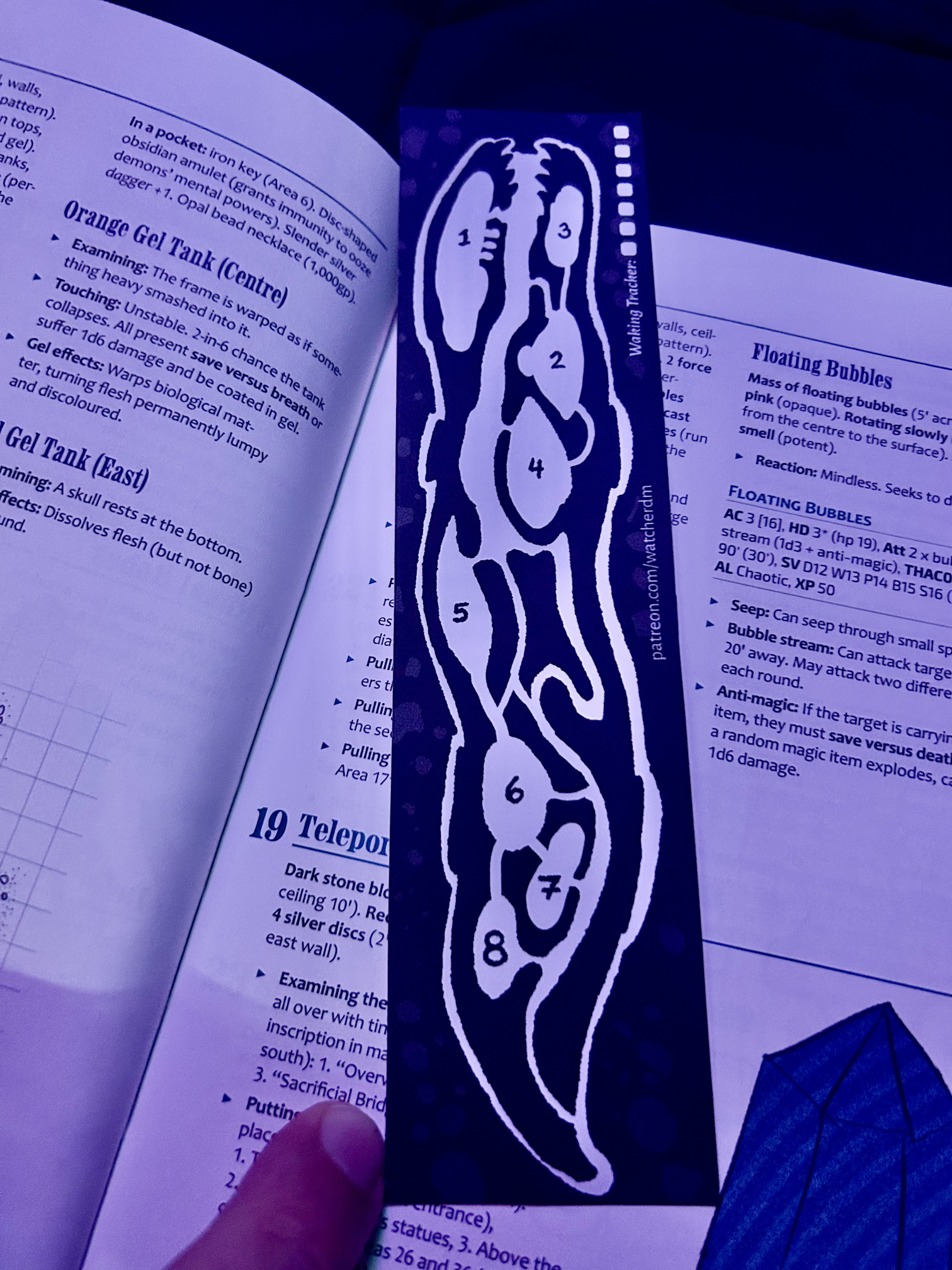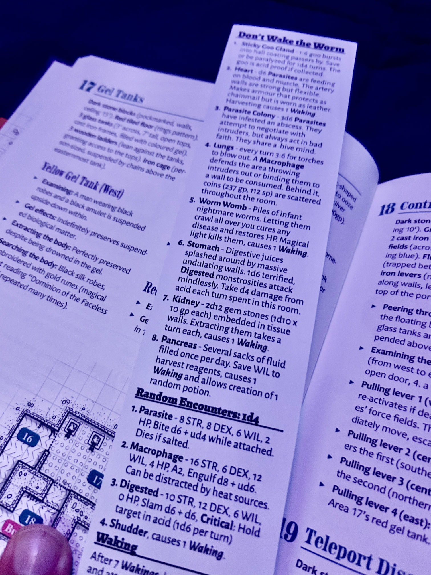 I've had this idea rolling around in my head for a while, I'm sure we all have. The party goes delving into some cave or another, but it isn't a cave, is it? Nope, IT'S A GIANT WORM! So now what? what is the inside of a worm as a dungeon? This bookmark tries to answer that question in a small package. The great sleeping worm can be a great place for the PCs to end up, looking for treasure, negotiating with parasites, or making random potions, either way when they produce 7 Waking events, the worm wakes up and wreaks havoc on the civilized world above.