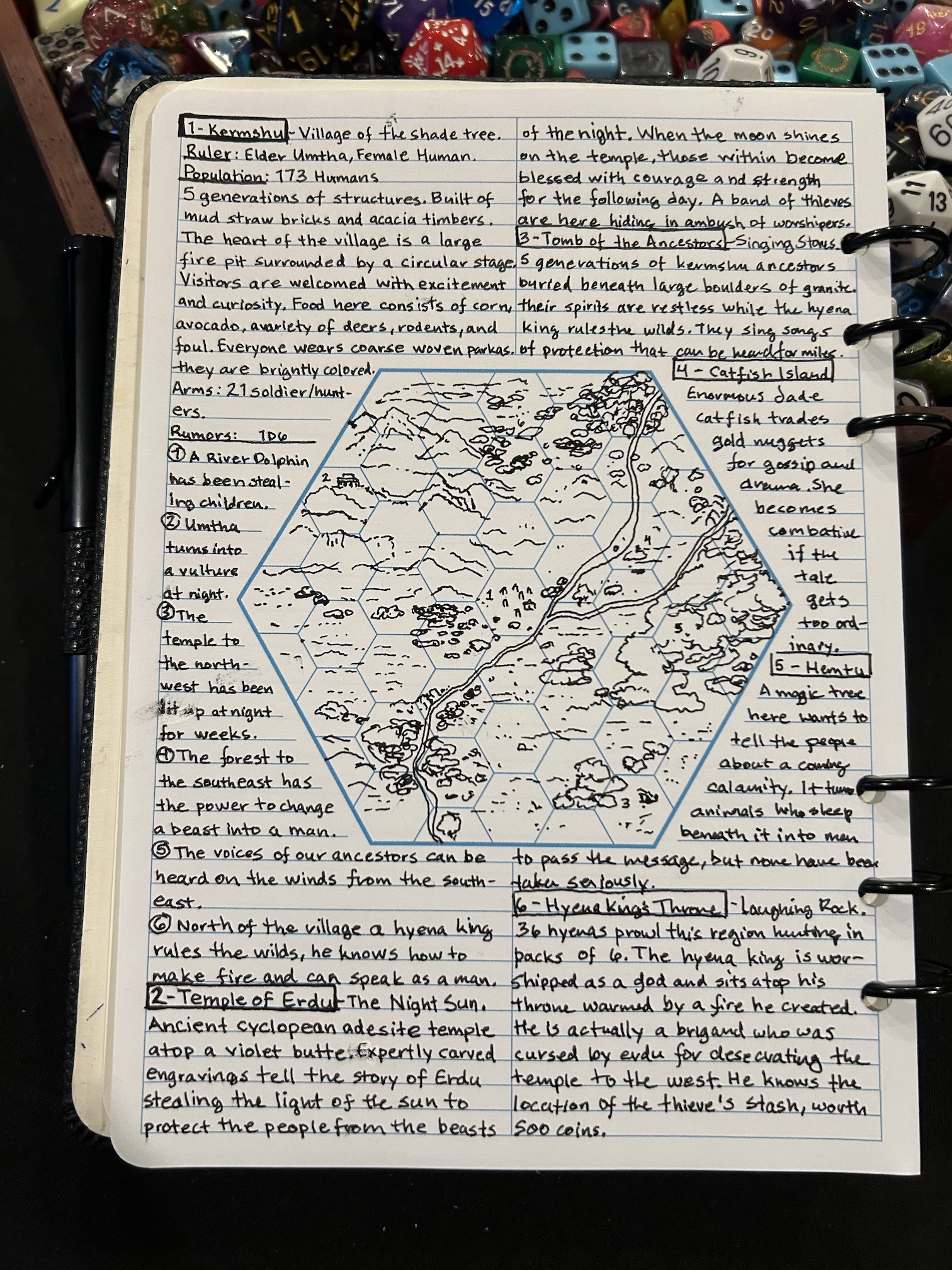 Hey guys, so I just wanted to make this post to tell you about my plans. So I made this little template here for doing hex maps. It should be linked to this post and My plan is in 2026 to work on my handwriting. Uh, making it more consistent, and becoming a more practised writer in general. And so my goal is to write 100 words per day. Um, going to be focussing those words on my 2024 dungeon. like 20 dungeon 24 uh things that I made. So I’ve done all the mapping, but I need to fill in the room details. So 100 words a day, a 100 words for each room is the plan, or at least a 100 words, I guess. And so this is kind of a pilot of that effort. So today I wrote this little, um, hex crawl, I guess, uh, with just some connected bits of fiction about a little place I was thinking about in a, like a savannah or a kind of, I don’t know, it’s like, I don’t know. It’s kind of maybe like an African region. It’s got it’s got certain characteristics to it that I think are very Middle Eastern or African. It’s got hyenas, there’s a hyena king. I guess Hyenas could live anywhere. It’s fantasy fantasy world, so. Um, but yeah, just a river and a little village and some temple and stuff. And yeah, I had a lot of fun writing it, and so I thought I would share it. And if you end up writing anything or making anything with this template, I would love to see it. So that’s my post today. Thanks.